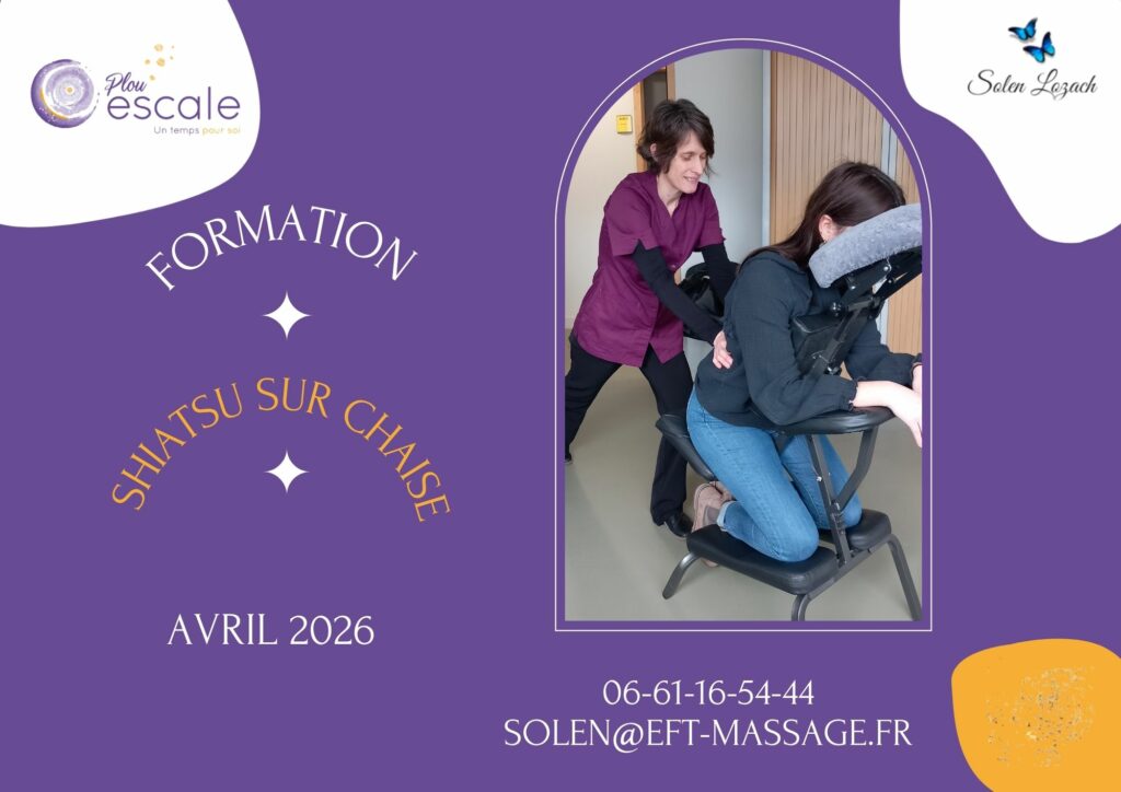 En avril 2026, venez vous former au 𝐦𝐚𝐬𝐬𝐚𝐠𝐞 𝐬𝐡𝐢𝐚𝐭𝐬𝐮 𝐬𝐮𝐫 𝐜𝐡𝐚𝐢𝐬𝐞 à Plou’escale, le centre de bien-être pluridisciplinaire de Plouescat, animé par Solen Lozach, praticienne psyschocorporelle.